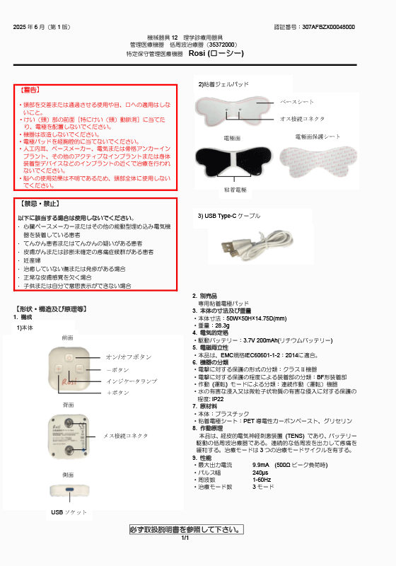 Rosiは、つらい痛みを和らげるために開発された日本の医療機器認証(クラスⅡ)、欧州MDR、米国FDA にて認証取得済みウェアラブルで、コンパクトな低周波治療器です。TENS(Transcutaneous Electrical Nerve Stimulation: 経皮的電気神経刺激)テクノロジーが使われています。身体への負担が少なく、非侵襲的でなめらかな電気の流れにより薬剤を使わずに痛みにアプローチします。