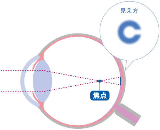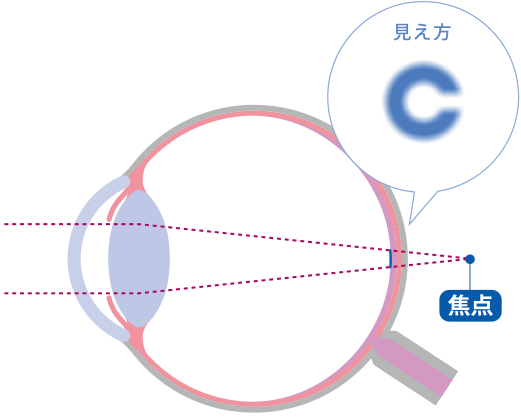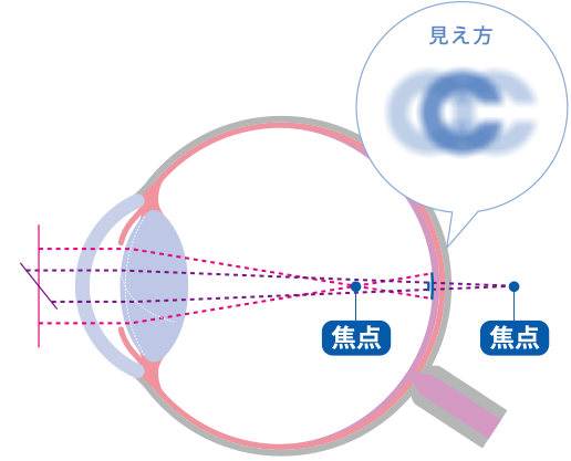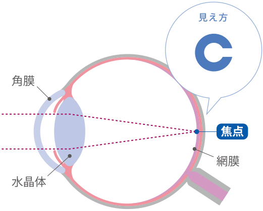 目の構造は、カメラと類似していると言われています。 眼に入ってくる光は「角膜」と「水晶体」(レンズ)で屈折し、「網膜」(フィルム)で像を結びます。網膜でピントが合わない状態を屈折異常といい、焦点のずれ方により「近視」・「遠視」・「乱視」に分類されます。
