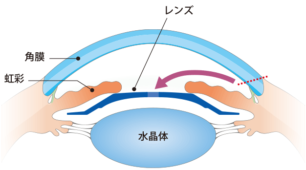 約3mmの小さな傷口から、柔らかいレンズを角膜の内側(虹彩と水晶体の間が一般的)に挿入して光の屈折を矯正する手術です。