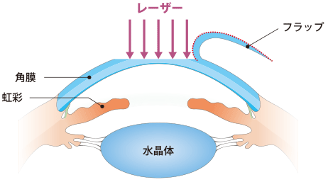 角膜表面に薄い円形状のふた(フラップ)を作り、めくった下の角膜の一部をレーザーで削り、光の屈折を調整する手術です。